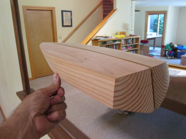 Half Hulls are made from a variety of woods, with a combination of cutting, carving, rasping and sanding. Basswood is a favorite of carvers, but I used pine, douglas fir, and cherry because they also shape well and I had large enough blocks. Making only one side allowed a realistic view of the shape, but also made sure that when it was measured and scaled up to full size, the final boat would be symmetrical. Putting them up against a mirror is an interesting way to expand the view to see at least part of both sides.