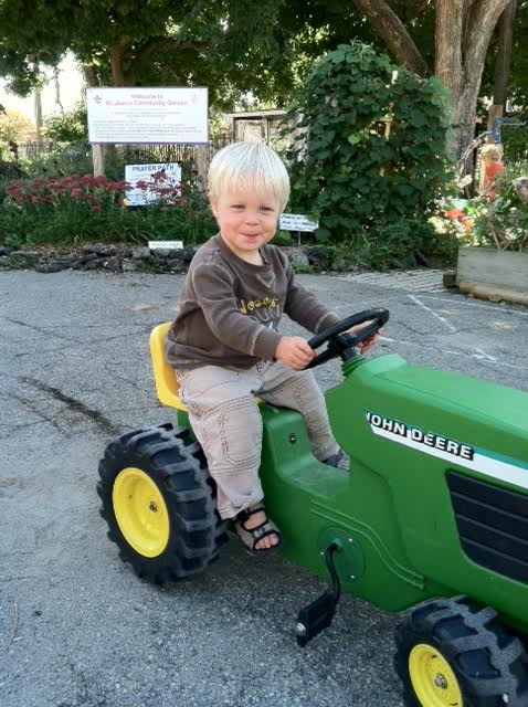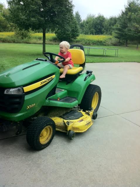 He was one and a half when he figured out how to climb up and get behind the wheel of the real John Deere lawn tractor all by himself.