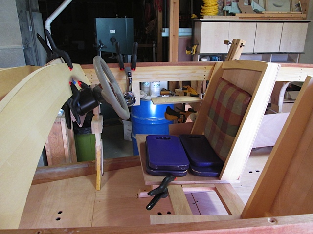 The driver’s seat in the modern car has to be comfortable for a wide variety of people, which is why there are an infinite number of settings. Building a wooden boat does not lend itself to such easy adjusting, so I am just making it to fit a generic adult man, and especially me. The actual mounting of the steering wheel and control lever is not so hard, but finding the perfect place is the challenge.