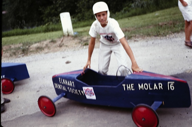 It did not compare so favorably to the elegant fiberglass and spray-painted cars built by the engineer and designer dads, but I might have won the “Build It Yourself” class if there was such a thing. My dad did jump back into the process to name it the “Molar 6” and show sponsorship. I raced twice and got beat two times, and then retired the racer to our home hill at 4333 (now 23905) Myers Avenue, Dunlap, Indiana.