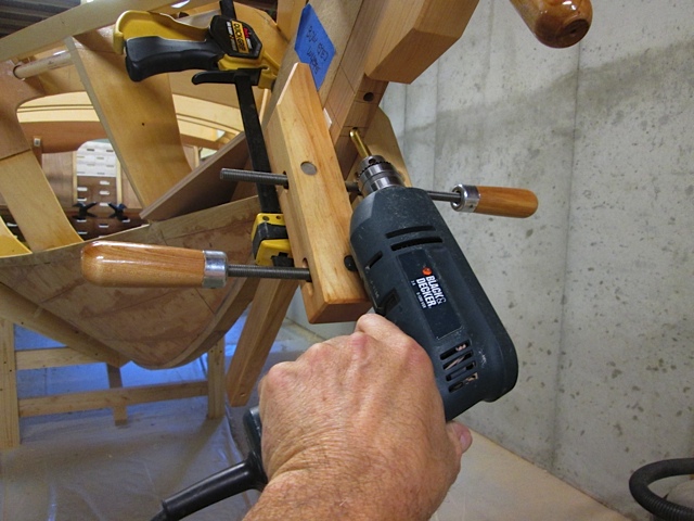 The bow eye is a small thing, with an important function of keeping the boat tied up. I had to devise a special drilling jig to get the holes accurately positioned in the front. It will eventually be epoxied into the white oak keel stem, which is the strongest wood in the framework.