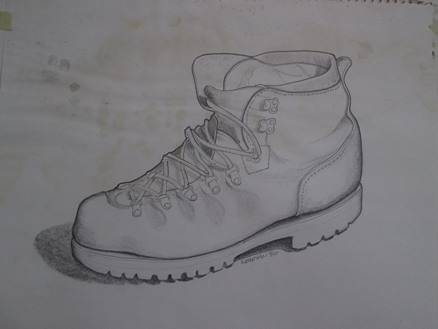 I already had the basics: a couple of flannel shirts, blue jeans, and a coat, but I needed some Colorado shoes. I went to the Red Wing Store and found some gorgeous leather hiking boots for $48.95. That was expensive in the 70’s. I liked them so well I drew a picture of them: