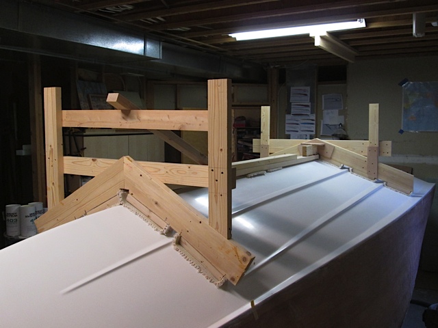 Turning the boat right side up was a great milestone, because the difficult bottom painting was done, and because I have no plans to turn it bottom up again. I first had to refit the cradle now that the bottom strakes were in place.