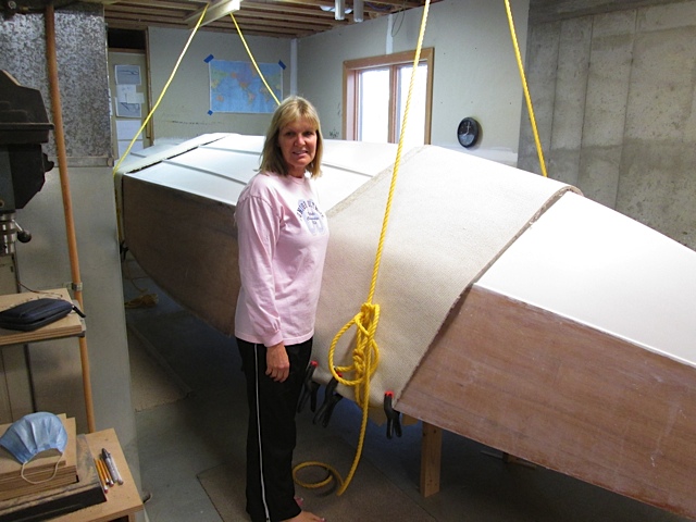 The only problem occurred when the side of the boat touched the floor as we hoisted and rotated it vertically. Below, Jeff Margush is supporting the bottom as we shorten the loops.