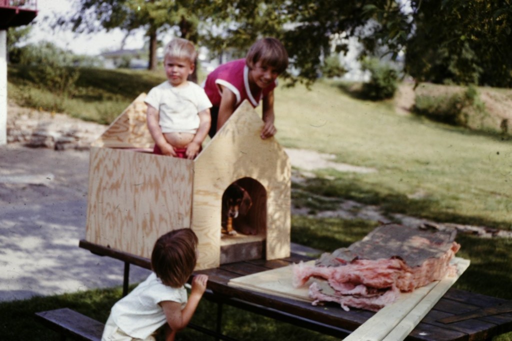 Photo of dog house, my sisters Margaret and Mary, and Brother Joe and our new puppy, Murphy..