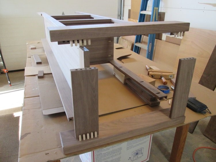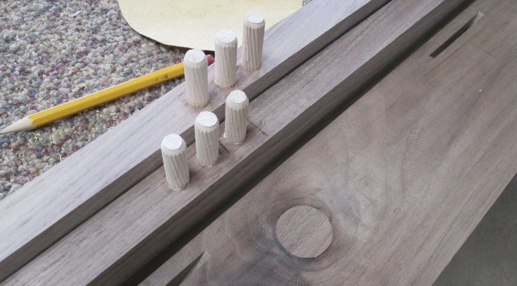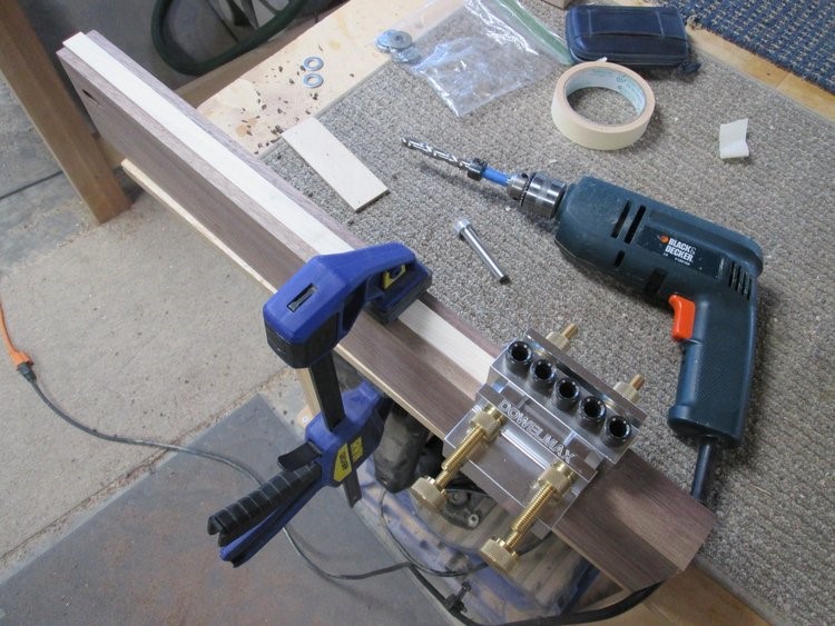 For drilling the holes, the best helper tool I have found is the Dowelmax. It is adjusted by adding washers to move the dowels farther from the edge, and I also use spacer sticks like the one shown on top of the walnut leg. This allows very accurate repeat positioning for each part of the process.