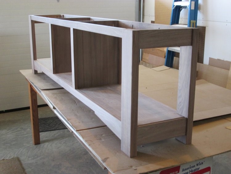 A recent project was a sofa cabinet which needed to be 8’ long. For the reasons of the long span, and the hope of it meeting the “hundred year warranty,” uncommon strength was necessary. The angled braces at the bottom give visual support, like the arch of a bridge, but they also stiffen the ends of the lower face frame, and make a wider connection to the leg.