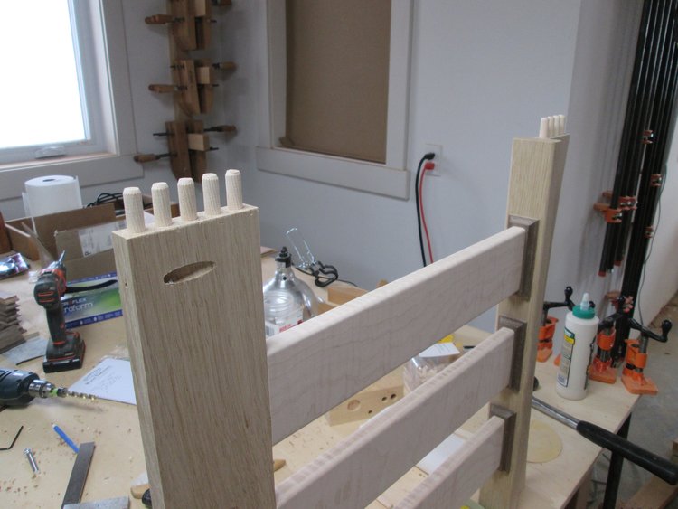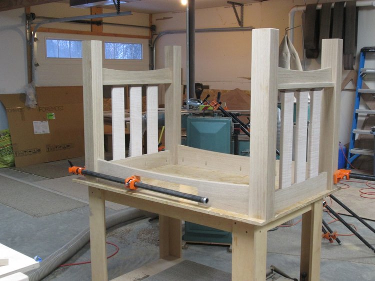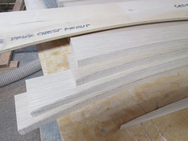 Barbra chose Rift Sawn White Oak for the main wood parts, and then we added some mildly contrasting curly maple for the slats and walnut for the slat bases. The combination is show above, with only a hint of the beauty coming after finishing.