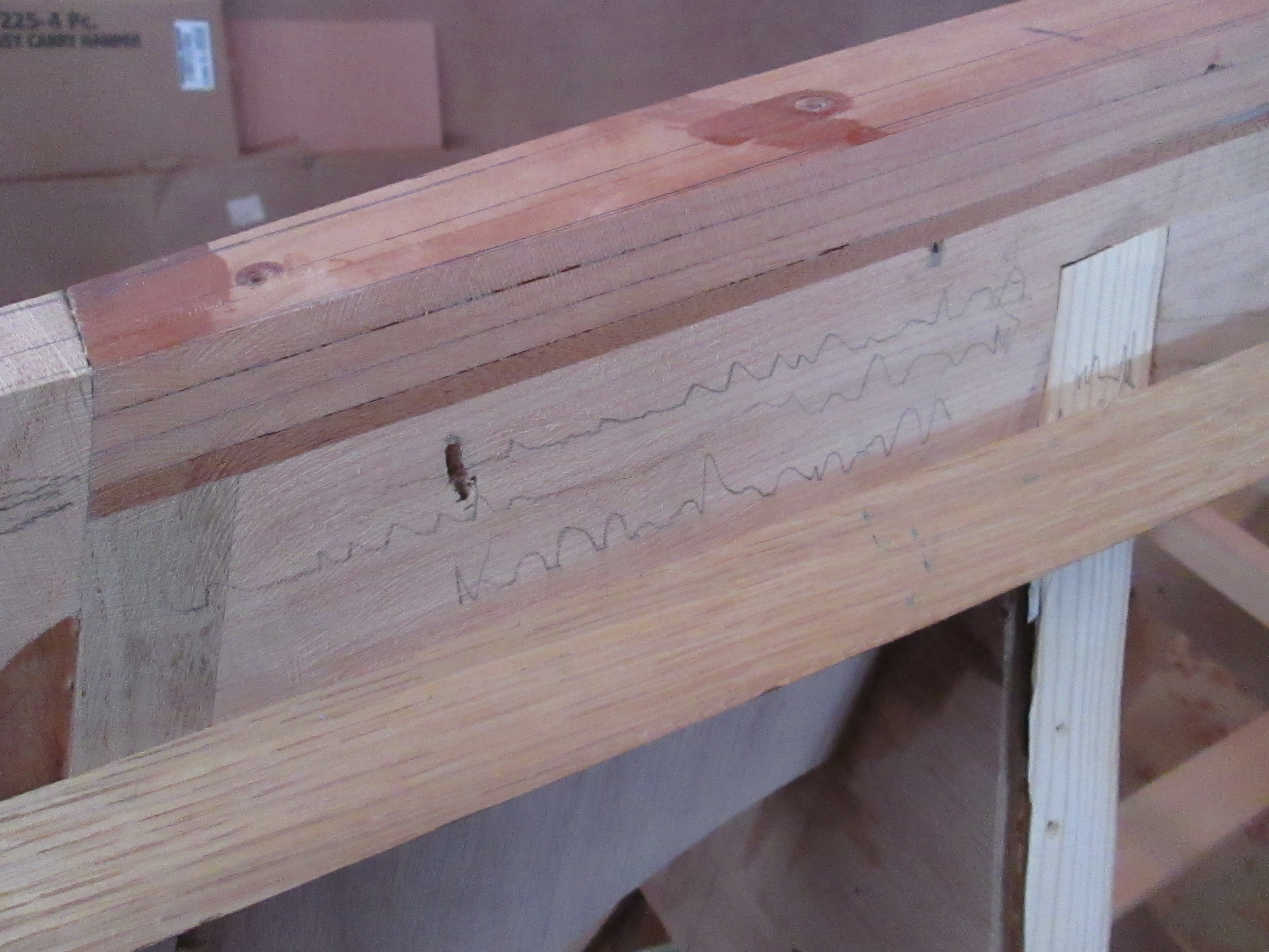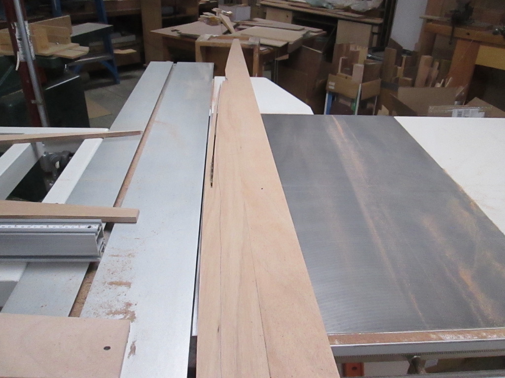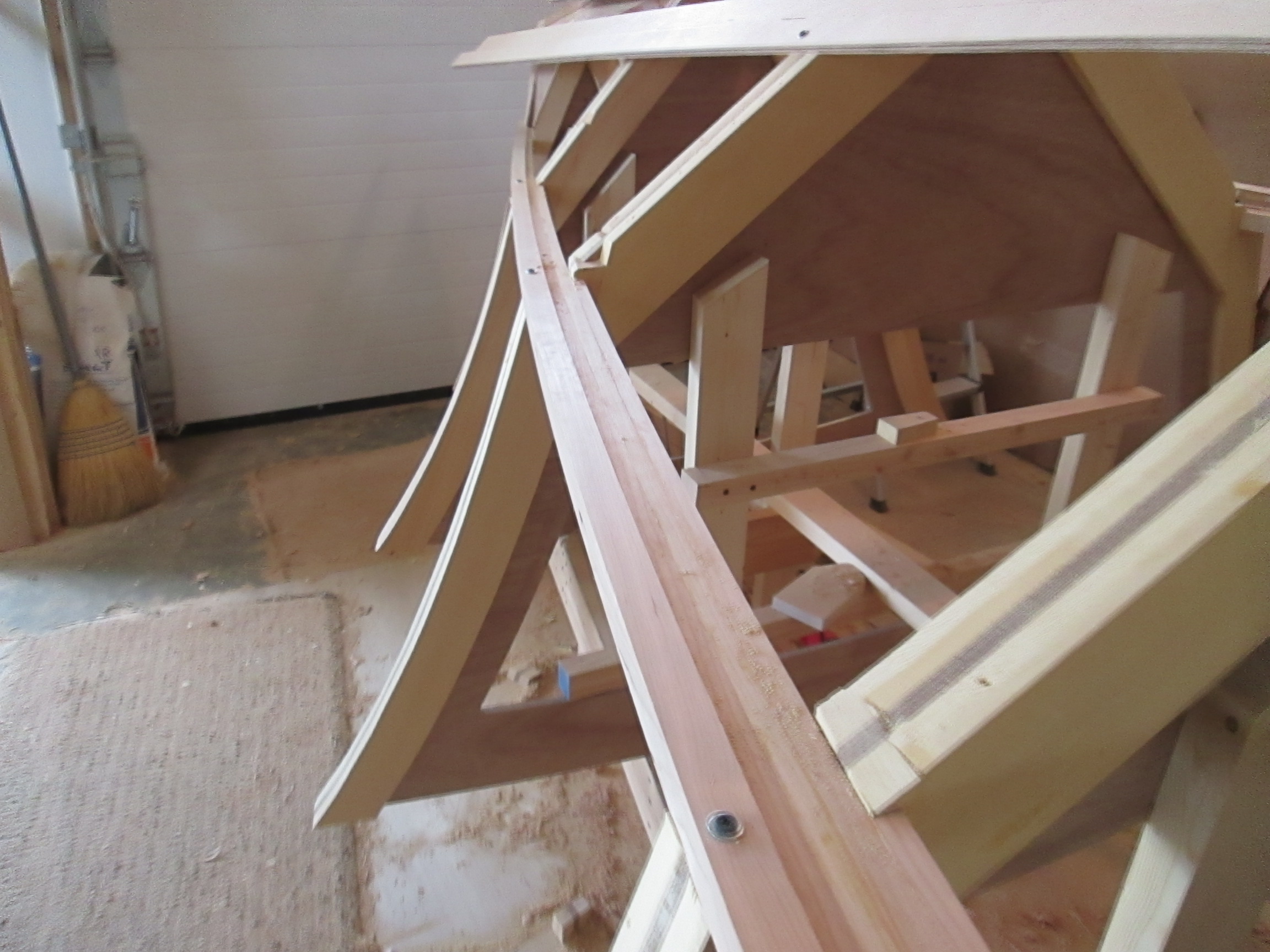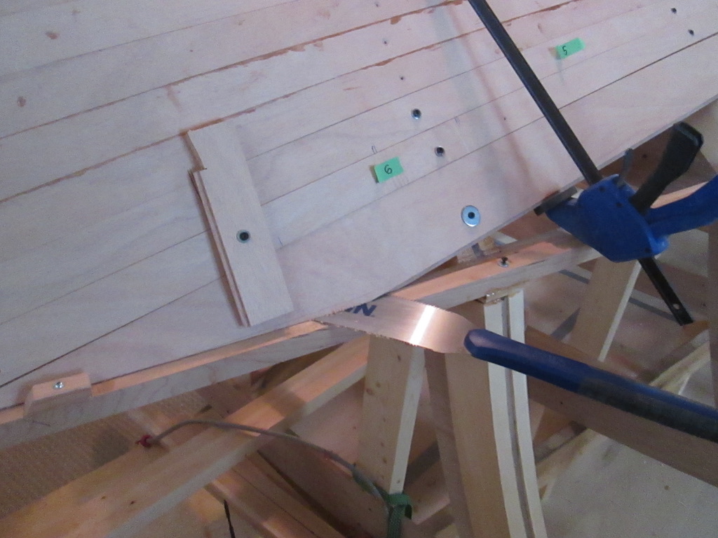 Where the planks come down meet the chine rail, the fit is more difficult. For a long curve, the cut can be done on the table saw to make an over sized plank.. It is a bit dangerous, but slow, steady cutting with gentle side pressure produces a good starter piece.