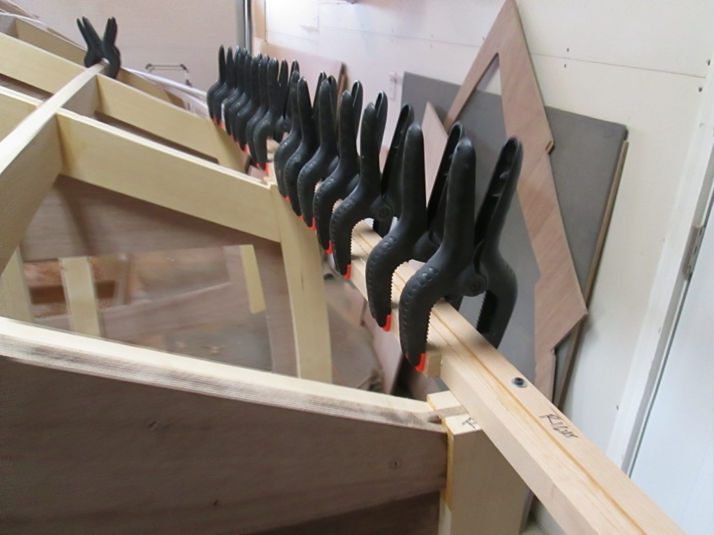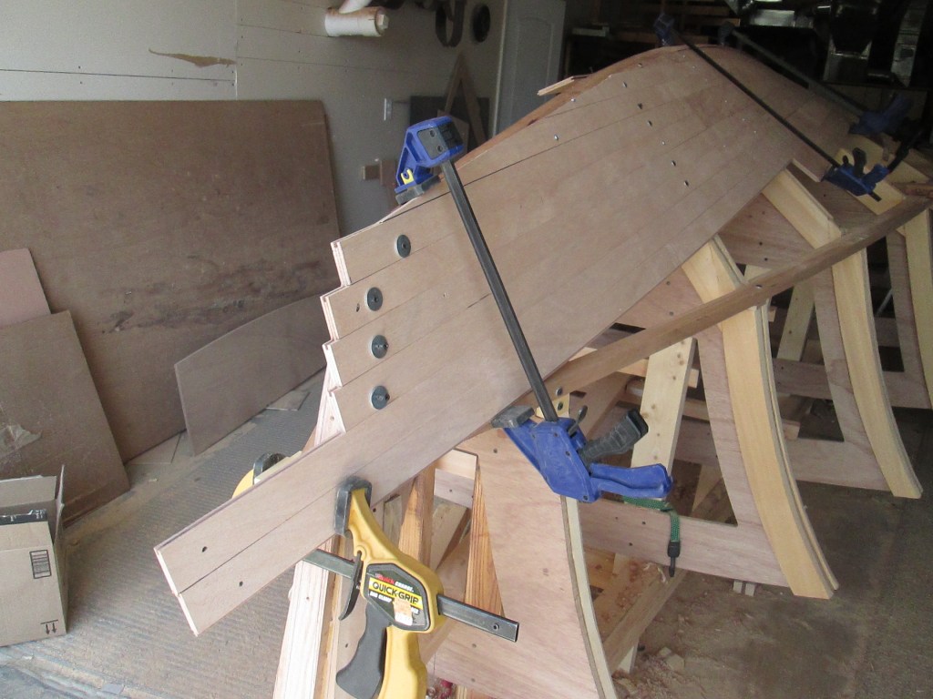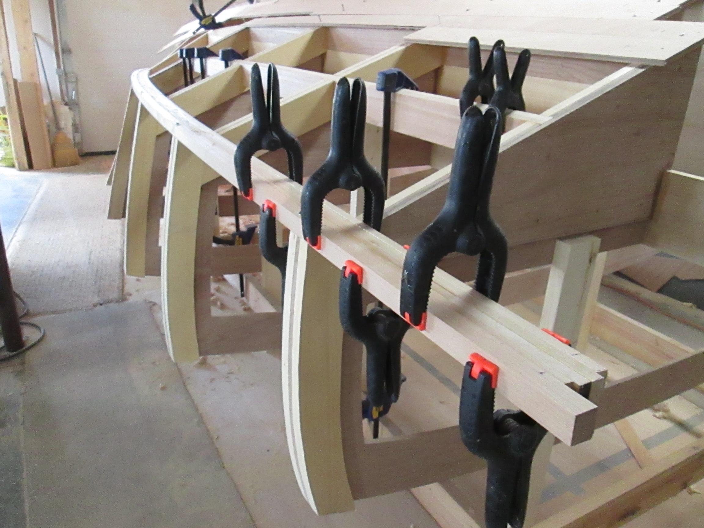 Boats, however, have so many curves that require different techniques to build and assemble. Laminating a straight piece to the curved chine stringer requires a bunch of clamps to persuade it to lay smoothly against the others.