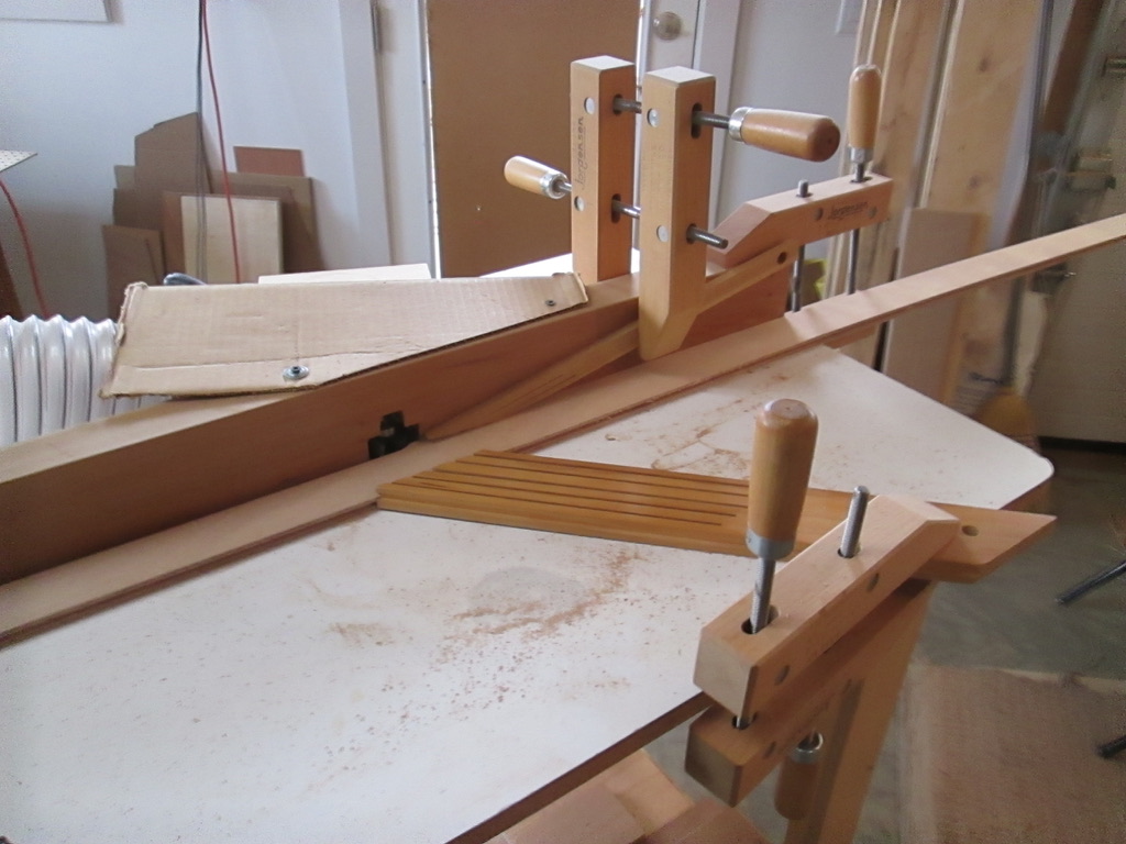 Another example is in the machining of the tongue and groove planks. It is dangerous to have hands pushing small, thin parts near the cutter head. These angled feather boards are clamped with pressure downward, and inward against the feed stock, to allow hands farther away from the danger zone.