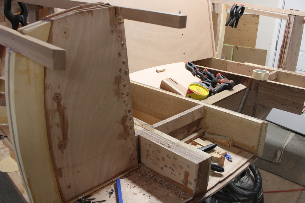 More plywood layers were added on the inside and out, connecting the top and bottom to make a strong outer panel. They are bonded with epoxy which is very tough and does a better job of filling gaps than most other glues.
