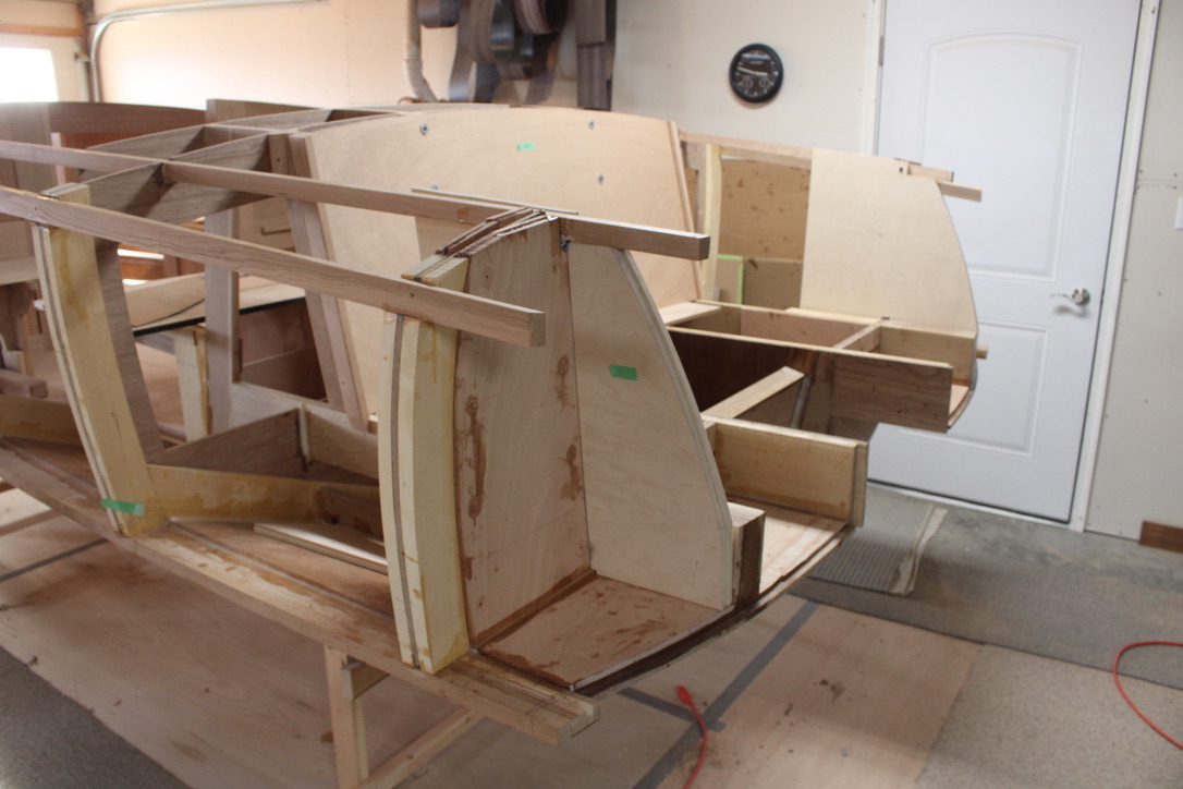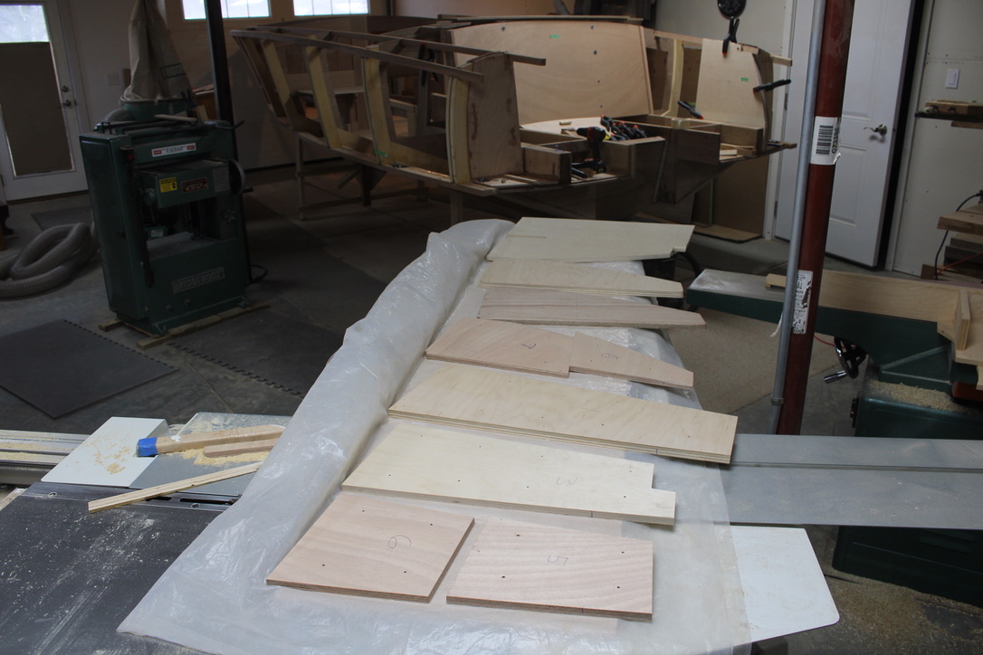 This is the group of eight plywood pieces that went into making the left (port) side wall. The right side was about the same. It did get a little complicated. The morning that I planned to glue both sides turned into a whole afternoon and made me late for supper.