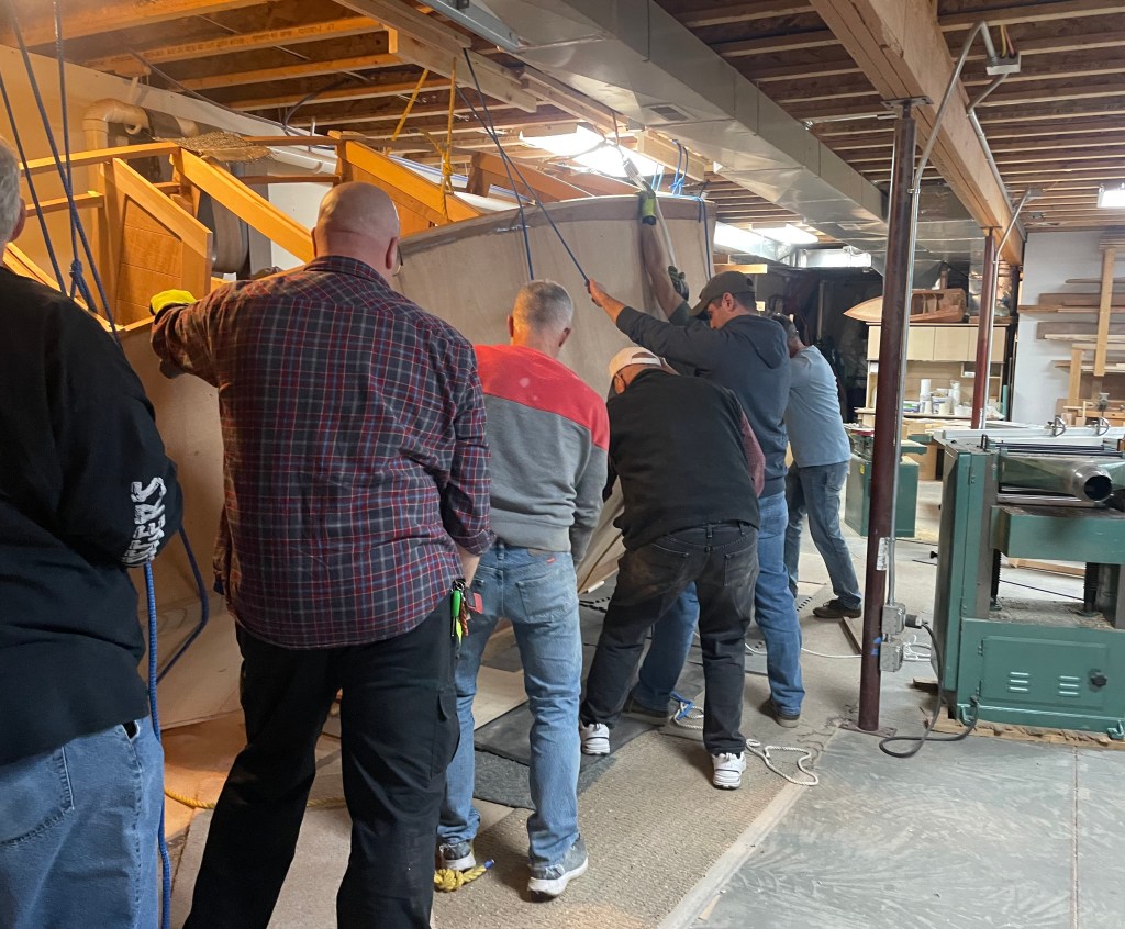 The construction of this 20′ speed boat started around January 2023 and by July the cross frames were connected with the keel, long stringers, and the hull planks on the bottom. It probably weighed 400 pounds and was a fairly easy job for a dozen relatives and friends to turn. We used two heavy nylon rope loops held by 2 x 4s, screwed to the ceiling joists to support the weight. It just took a little muscle to settle it on to the custom cradles made specially to fit the bottom.