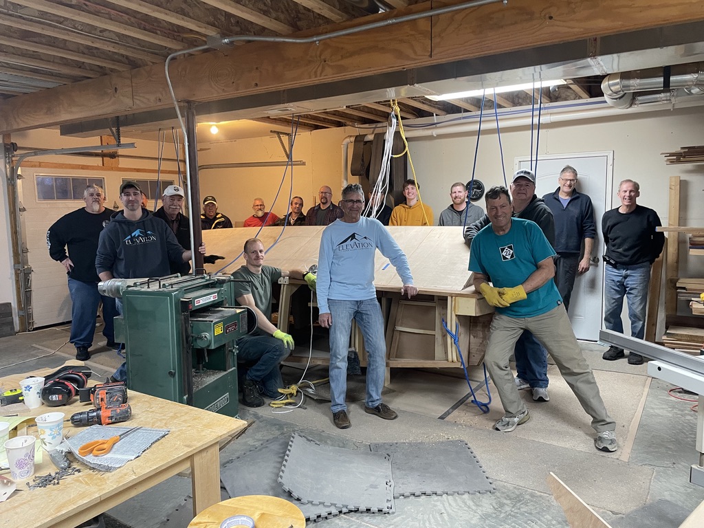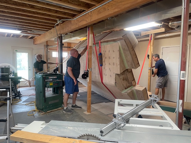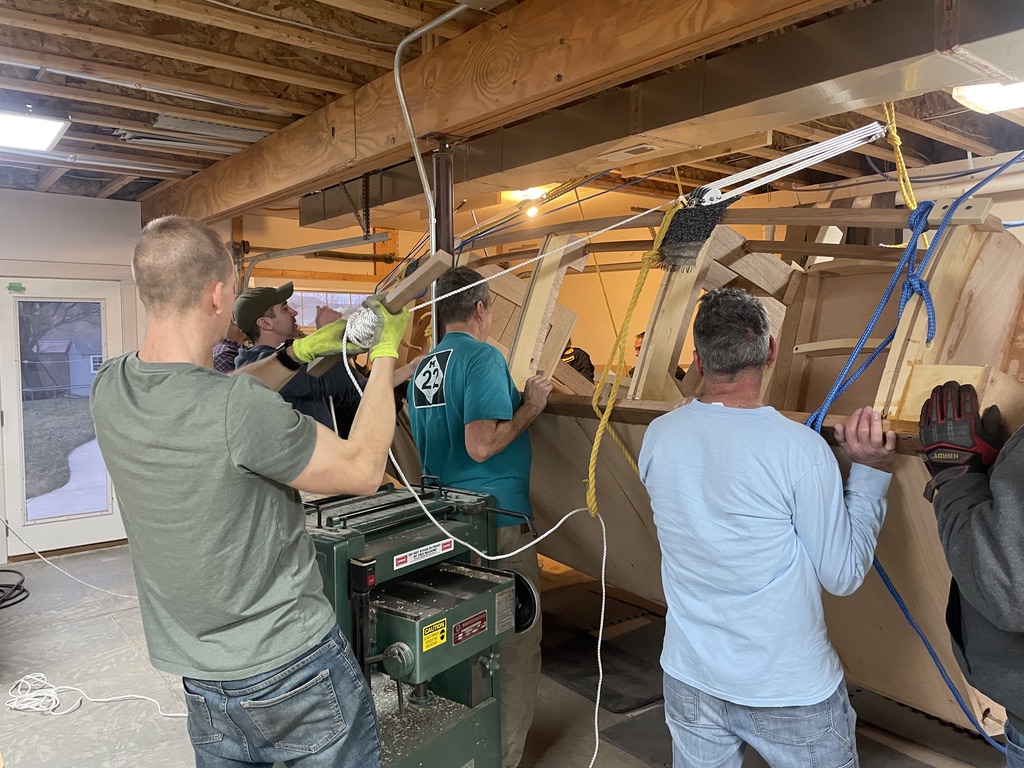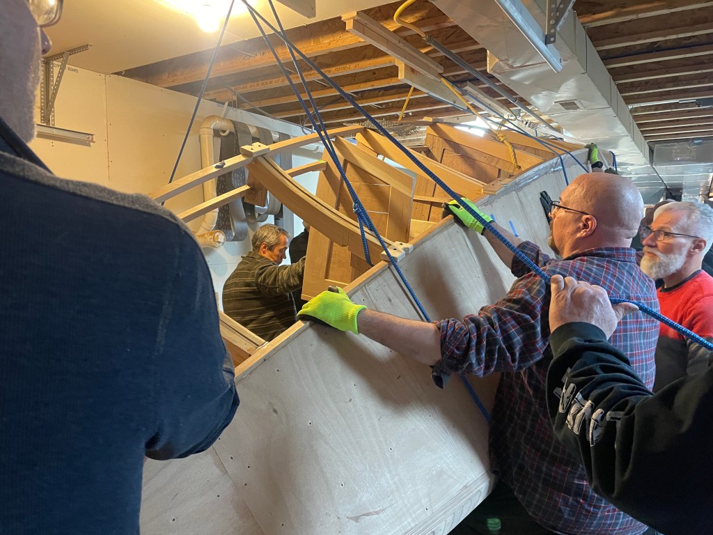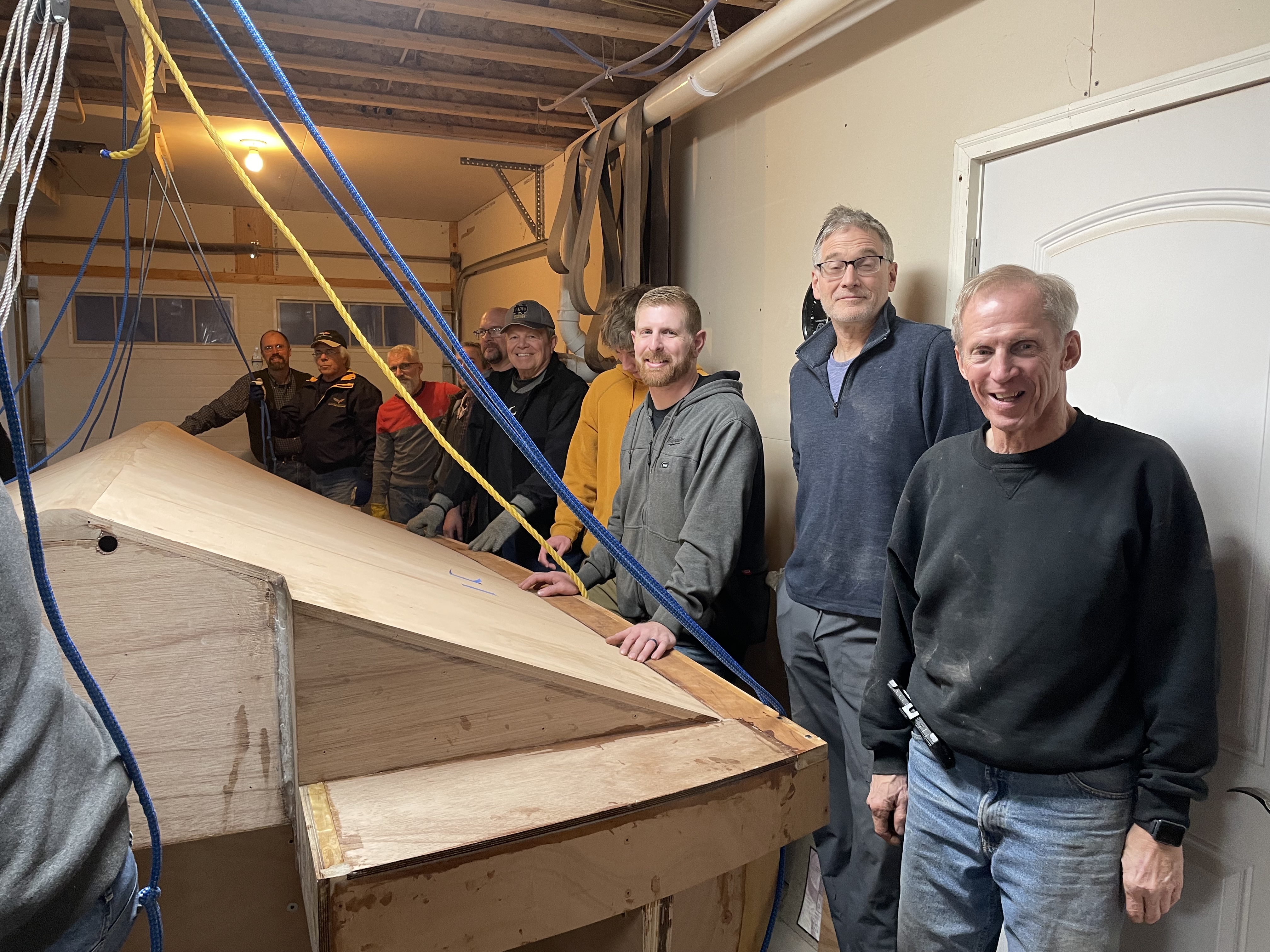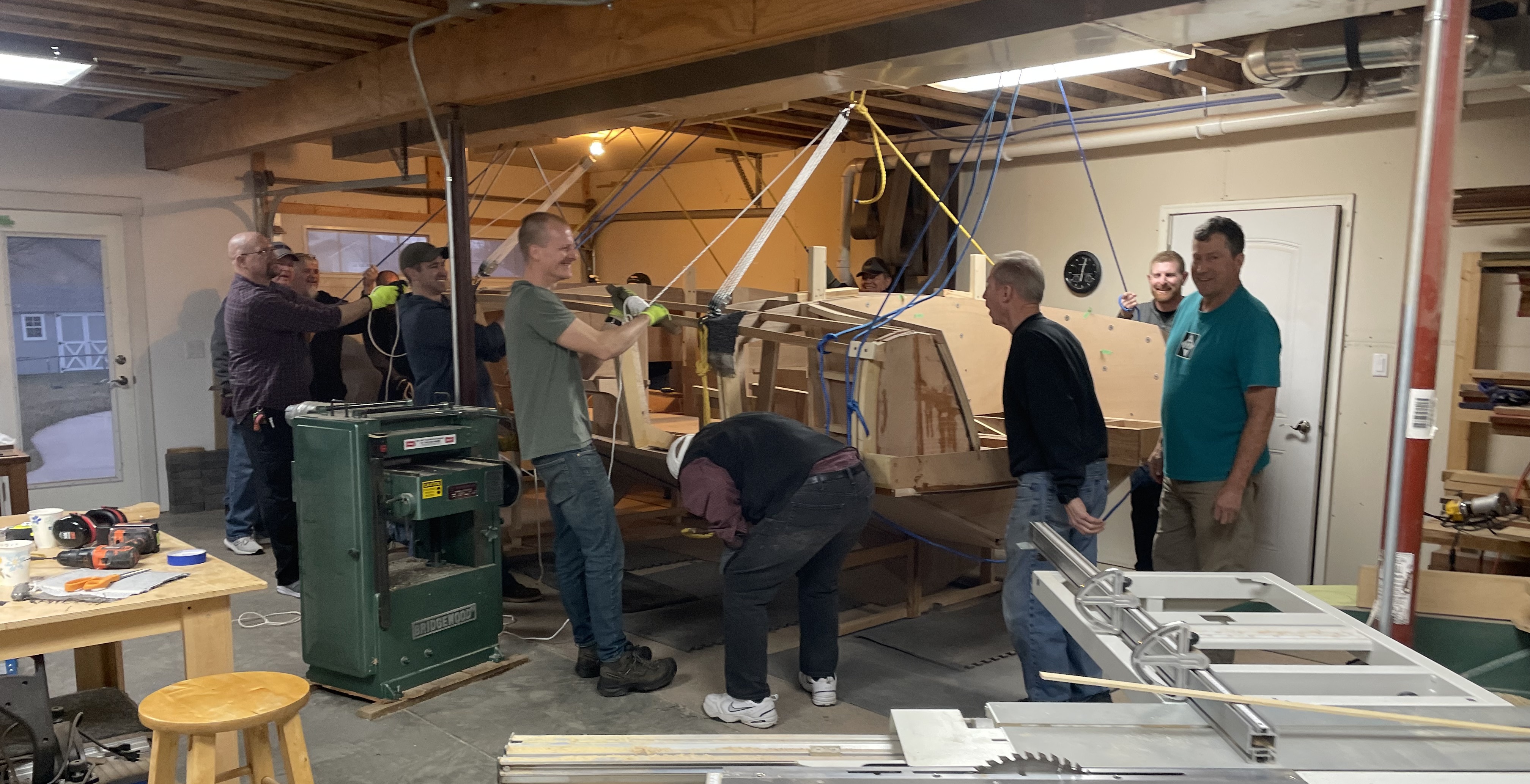It was all good until the rope connection at the ceiling for the front pulley gave way. The T-shaped 2 x 4’s screwed to the ceiling joists held firm, so the rest of the ropes were still useful. It just took a bit more muscle. Below are Don Florea, Chris Friend, Mike Friend, David Veale, Doug Martin, Kenyon Lederman and others.