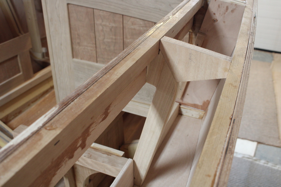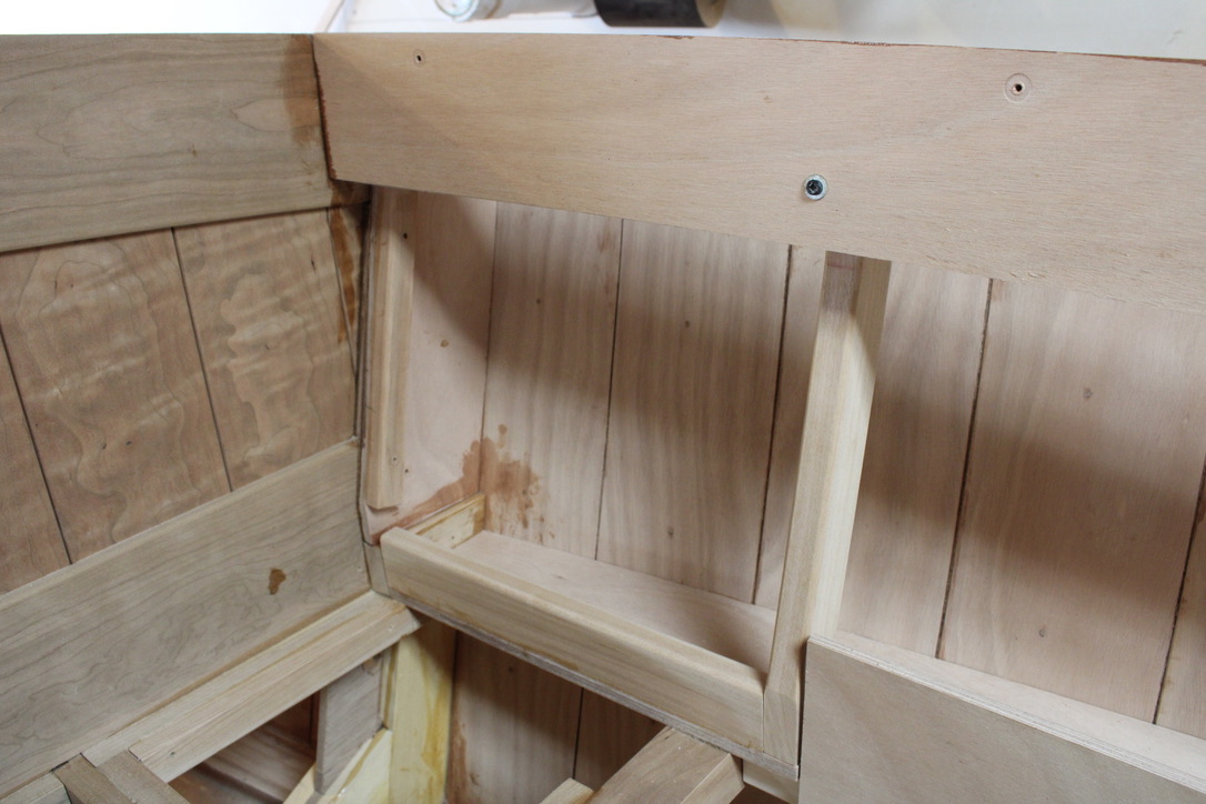The third piece of the vertical leg was added on the inside of the front sandwich. Then three pieces of Baltic Birch plywood were laminated and epoxied into place at the top of the legs.