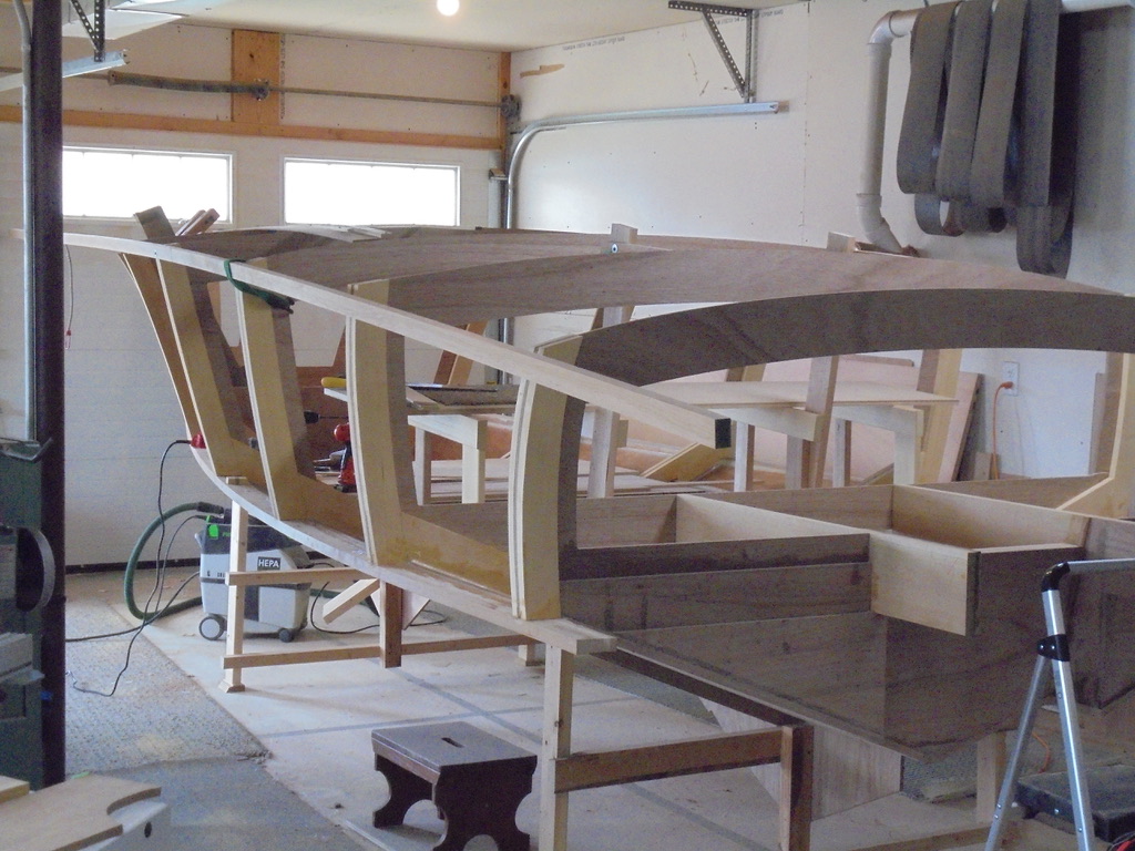 This is the group of eight plywood pieces that went into making the left (port) side wall. The right side was about the same. It did get a little complicated. The morning that I planned to glue both sides turned into a whole afternoon and made me late for supper.