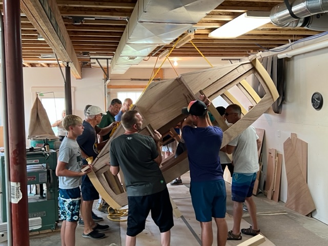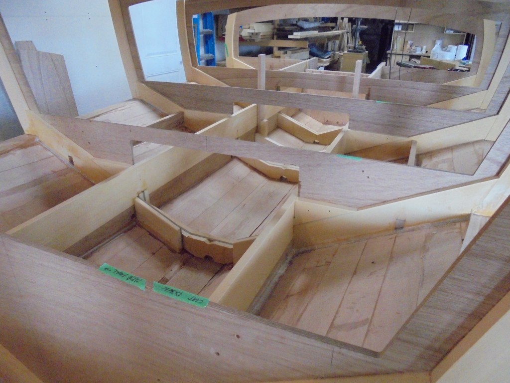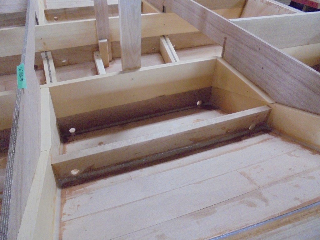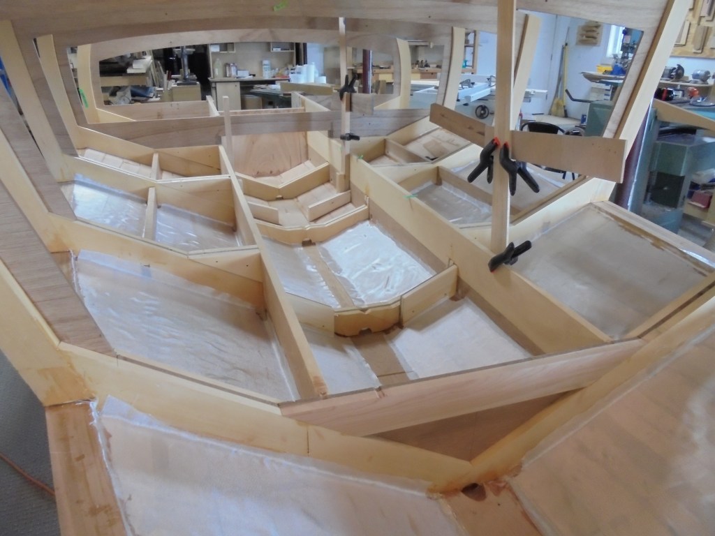 The next reinforcement to the hull is to add fiberglass fabric into each of the bottom sections. When possible, the pieces are cut to wrap slightly up the sides, covering the epoxy fillets. This serves to further strengthen the frame to hull joint, but also stiffen the tongue and groove plank layer of Okume marine plywood.