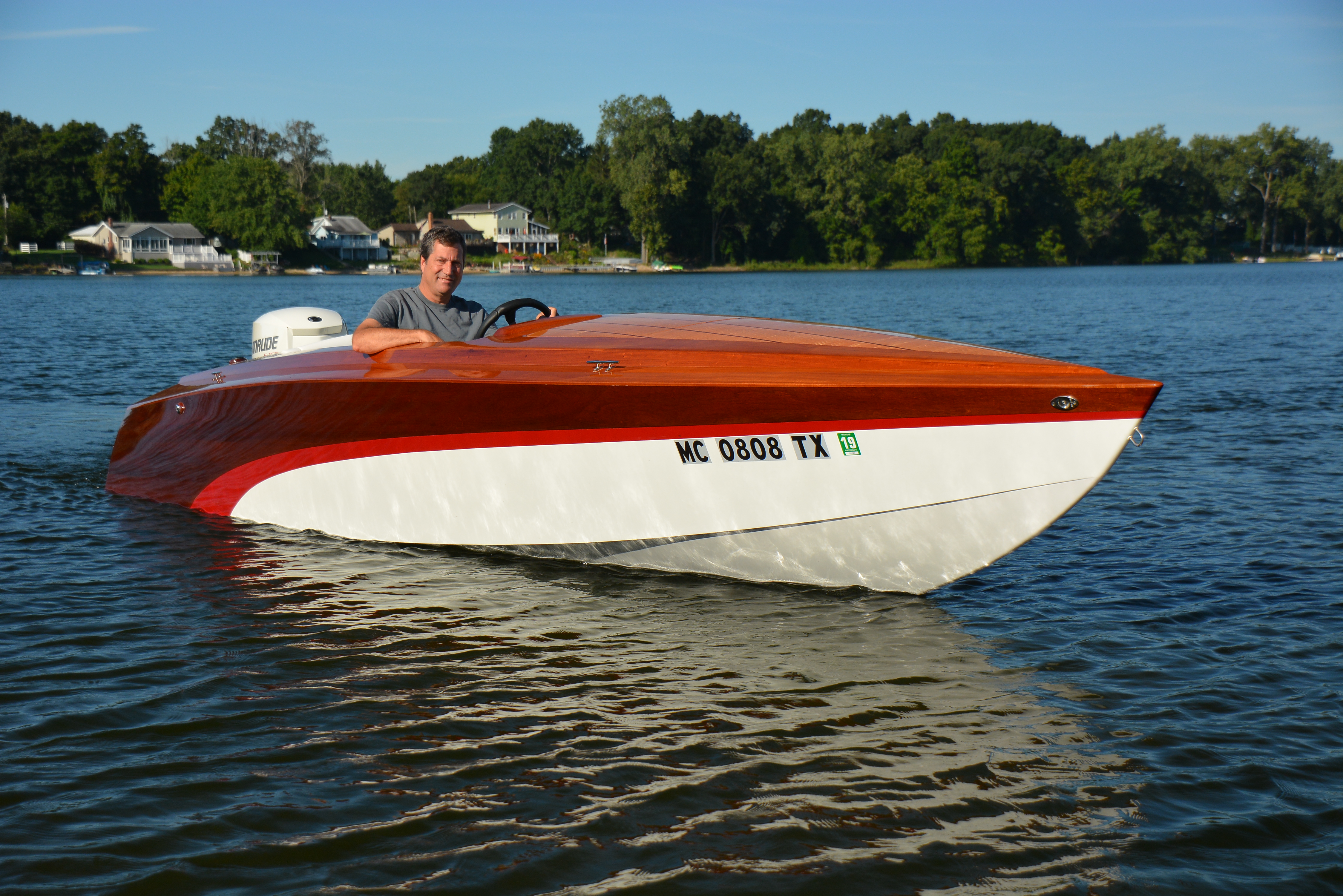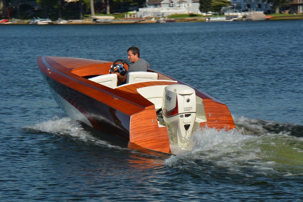 First day in the water on Pleasant lake in Edwardsburg, Michigan. The 135 HO Evinrude fuel injected 2-cycle fits the historic woodie attitude and gives it a good push.