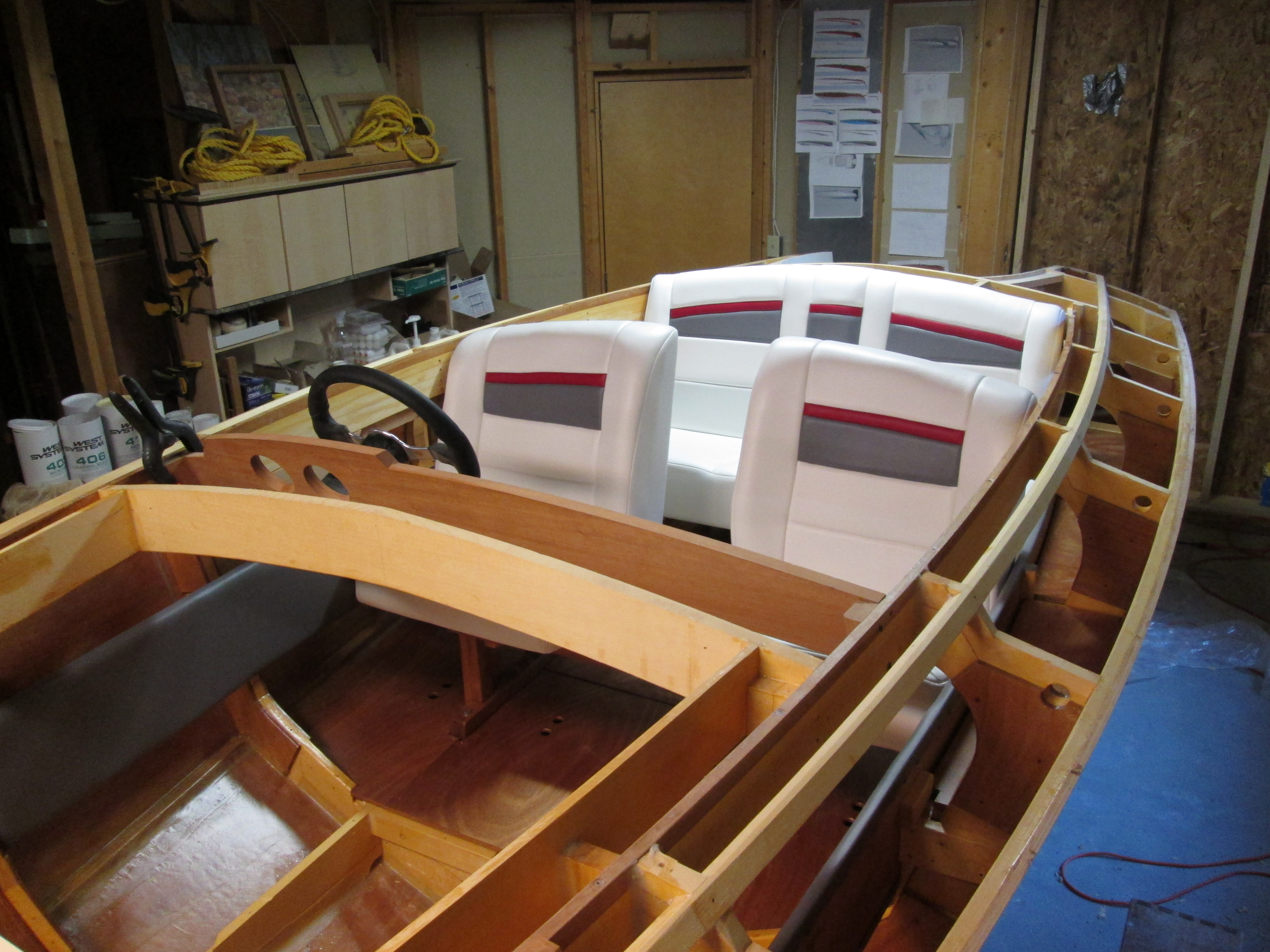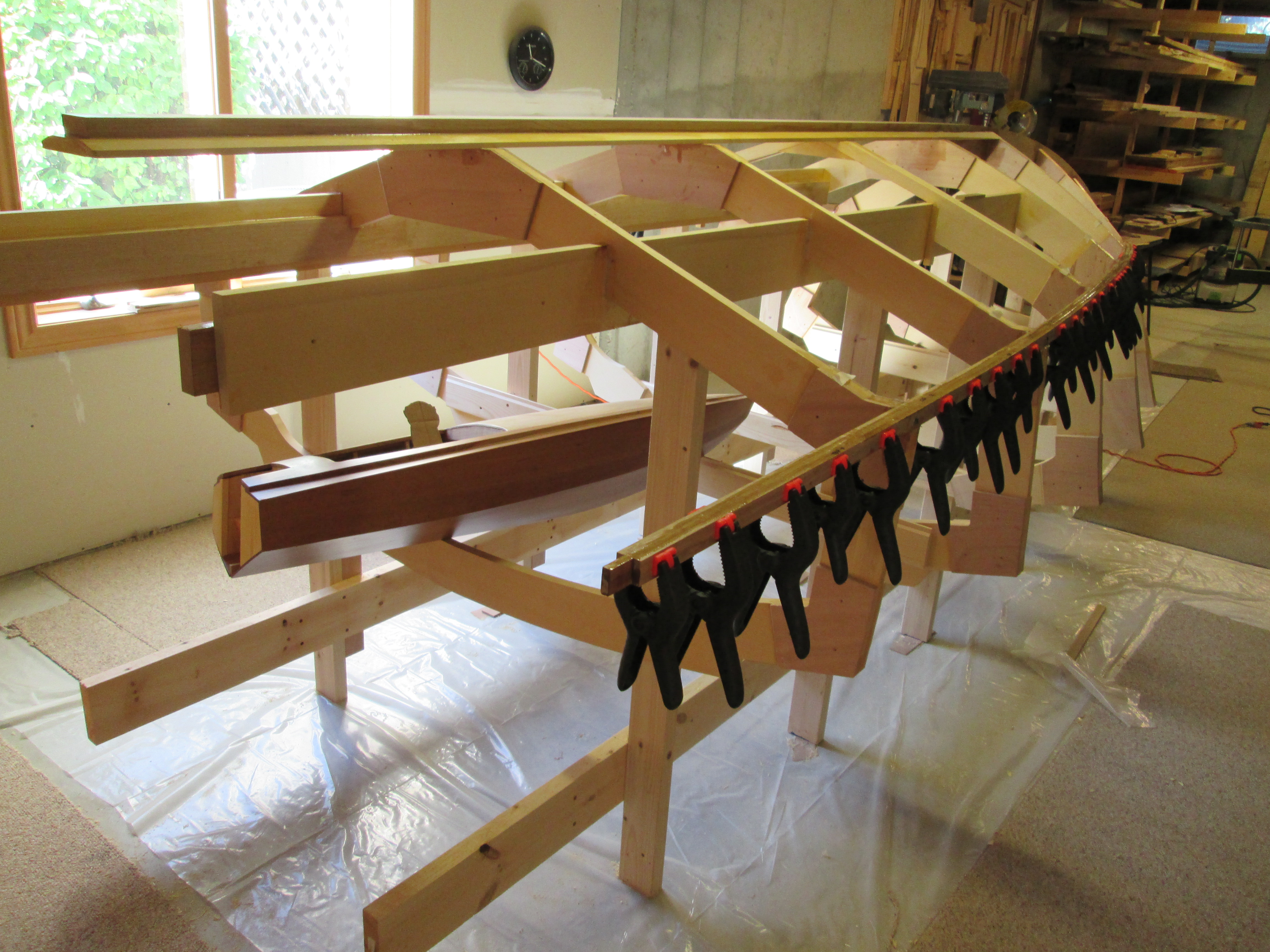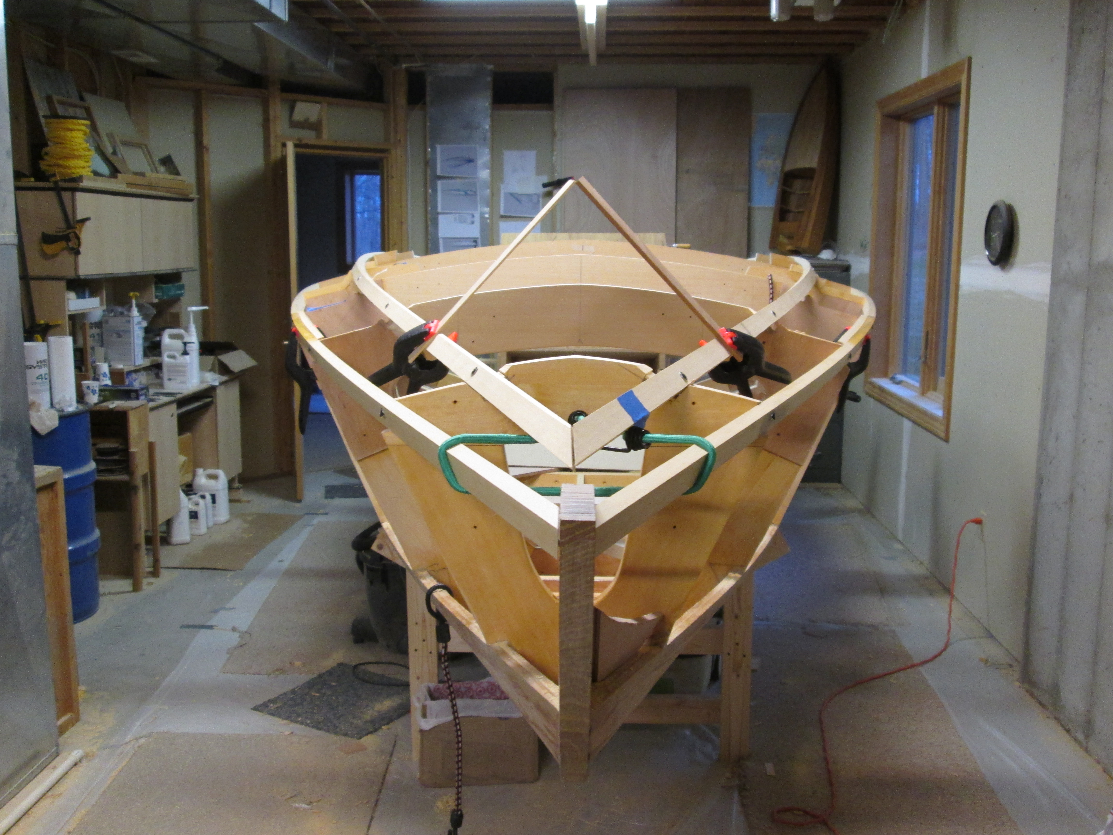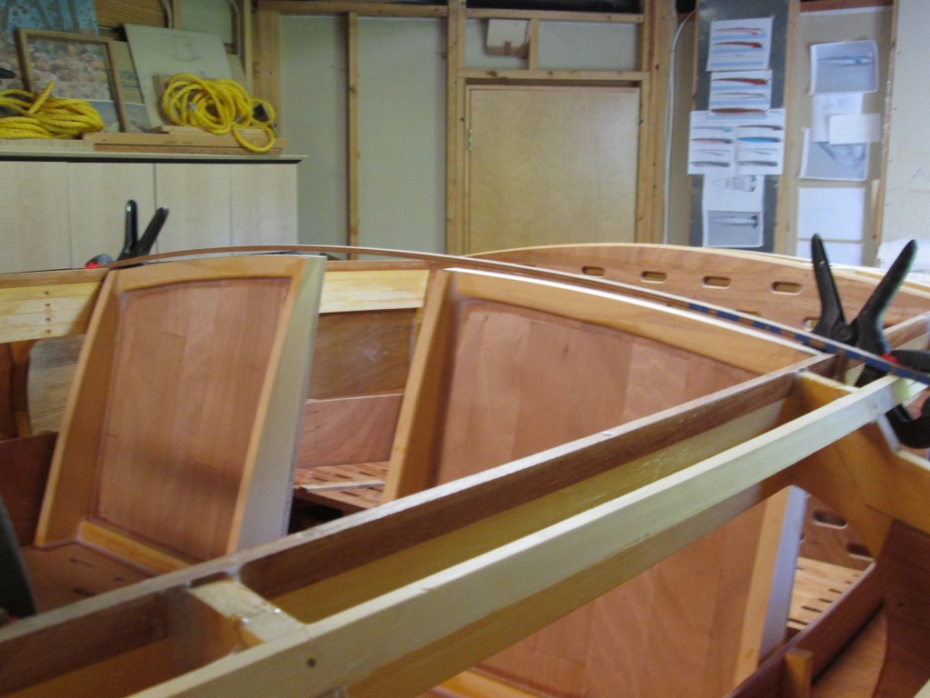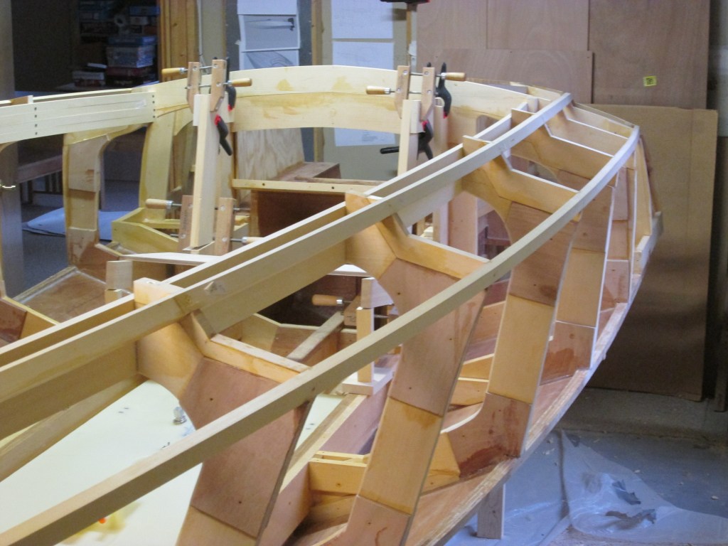 Adding the keel, laminated white oak chine log, internal longitudinal framework.