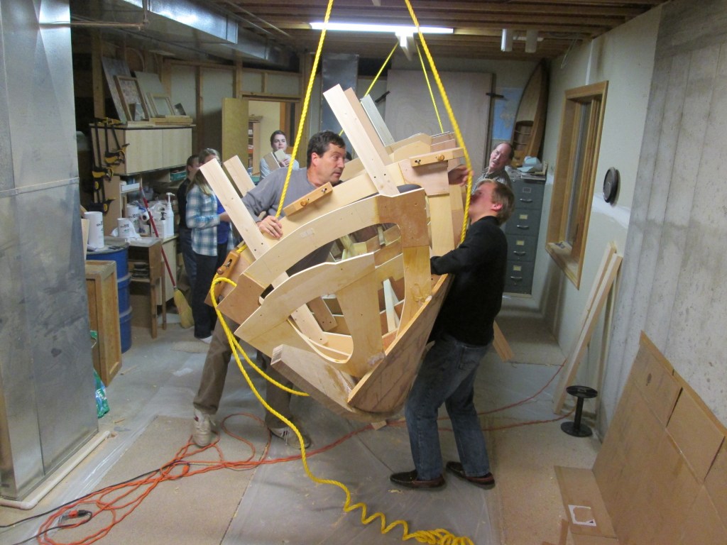 First turn of the boat suspended from the ceiling joists.