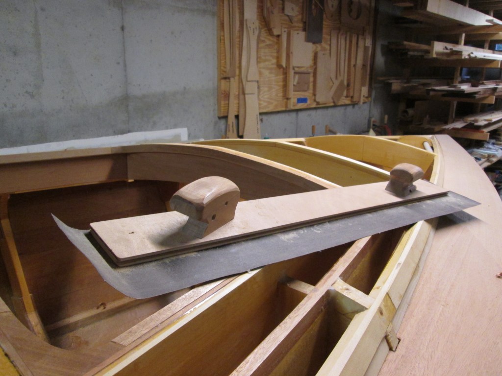 Fitting the 1/2″ Okume Marine plywood, which I cut into planks and tongue and grooved them to help with self fairing.