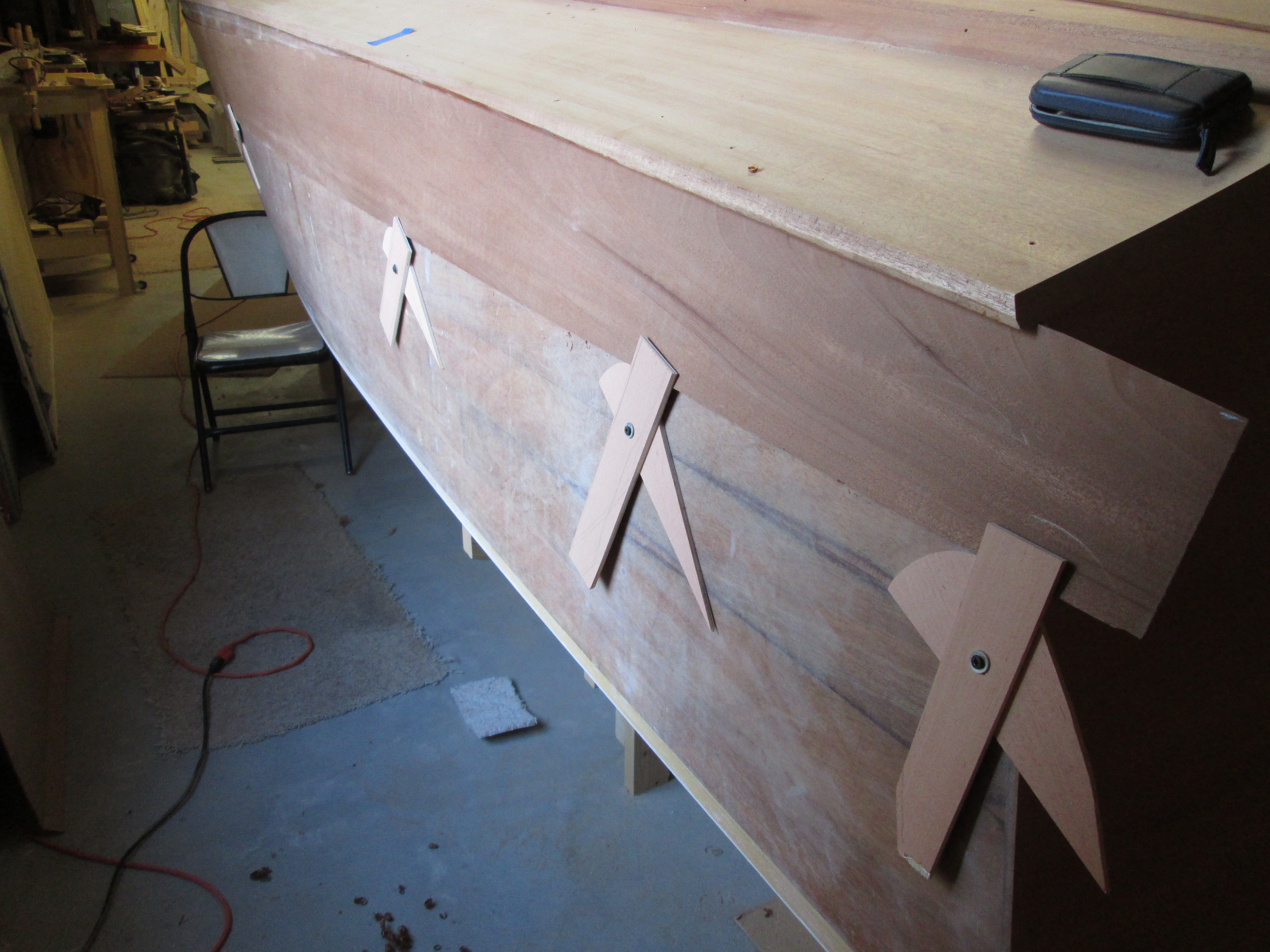 My system to hold the 7″ by 12′ Mahogany veneer pieces for the sides. The top piece just held the veneer from slipping out, and the eccentric lever created pressure up. It allowed me to see and adjust fit problems.